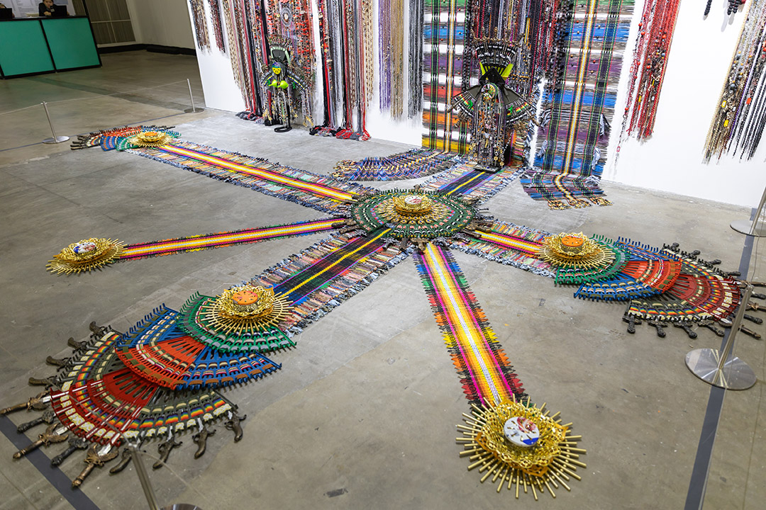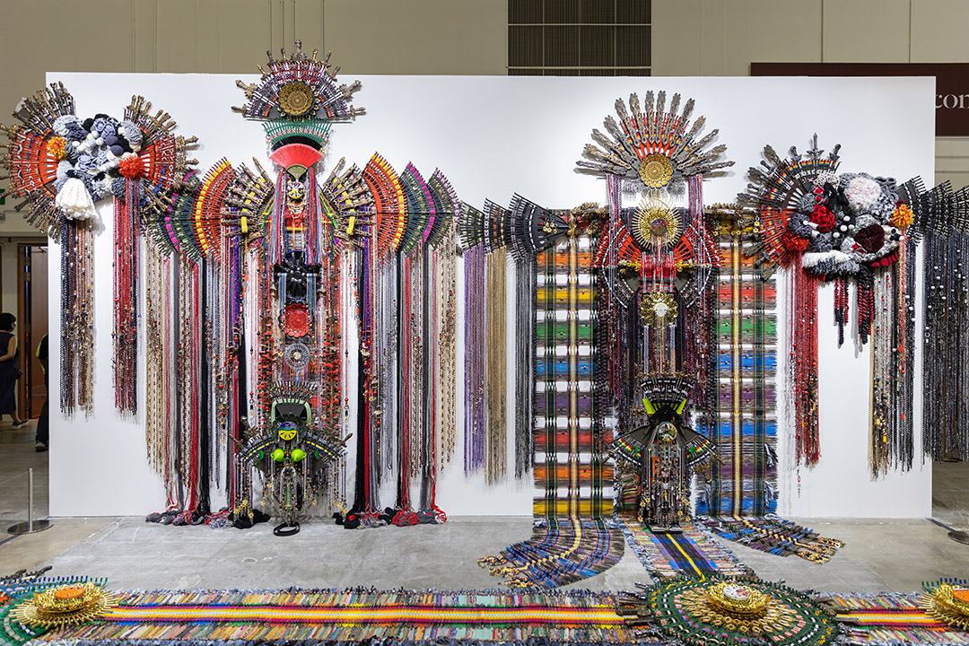Anne Samat (b. 1973, Malaysia) returns to Singapore eight years after her first major exhibition in the city with the exhibition of her monumental work, It Feels Like Home… The Journey Continues. This piece marks a full-circle moment in her career. Anne Samat’s new work merges traditional Malaysian weaving techniques with everyday materials to create a totemic self portrait, reflecting her journey across continents, transforming ordinary materials into a meditation on memory, migration, and the connections that have shaped her artistic path.