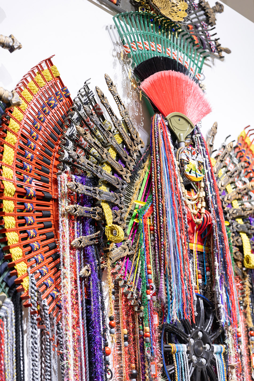 Table loom woven pieces, Pua Kumbu fabric, hand painted rattan sticks, acrylic and polyester yarn, rakes, plastic swords, mosquitoes coils container, washer, wooden beads, pipe clamp brackets, keys, wine corks, curtain holder, plastic and metal ornaments.